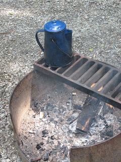 I put who-knows-how-many crude tablespoons of ground coffee into a ceramic coated aluminum camping peculator filled with water. It bubbled for 10 or 15 minutes, hissed and spread a gorgeous aroma around the campground. We drank it out of ceramic- aluminum cups (same material as the perc) and half burned our lips.
